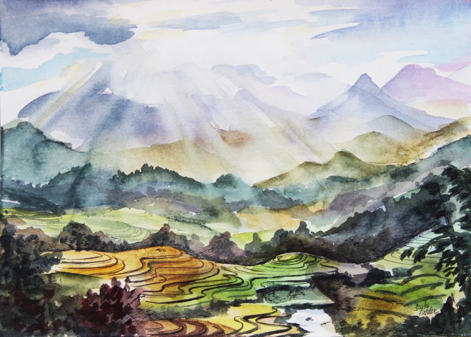 There are no particular subjects. Sometimes, I just walk down the street and see a person or a landscape, and a composition begins to form in my mind in oil or watercolor. It is always unpredictable. Lately, I’ve been very inspired by landscapes and Vietnamese children.