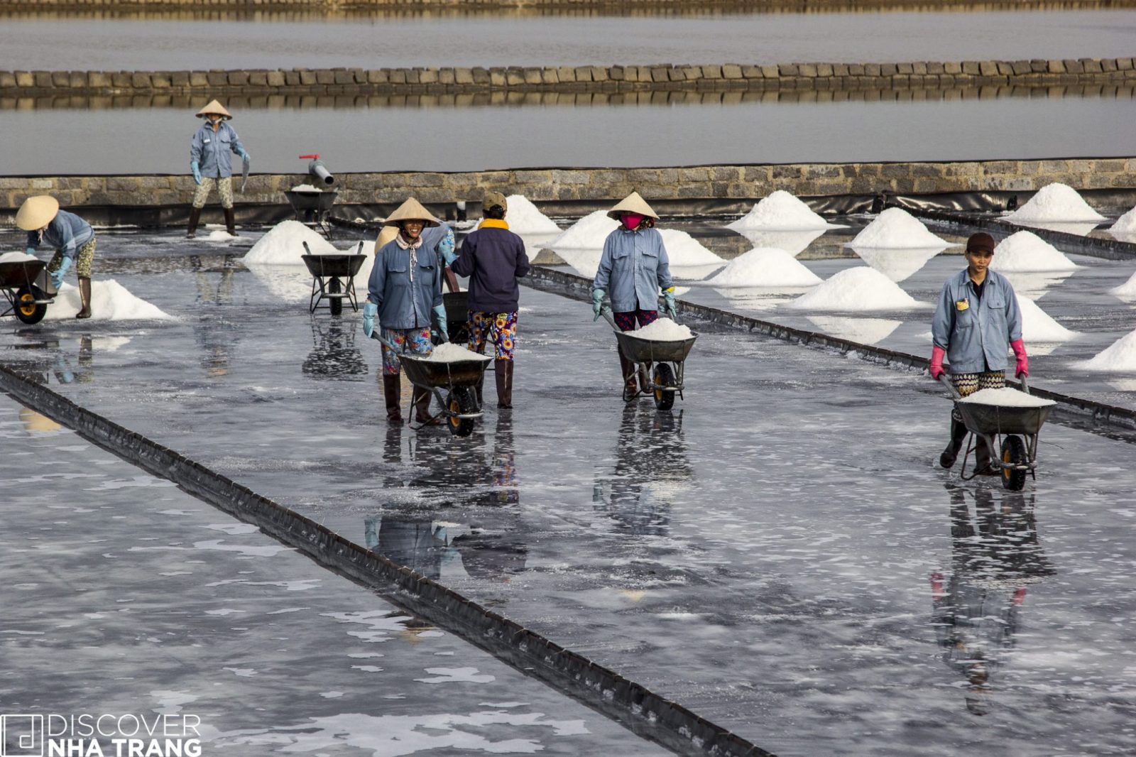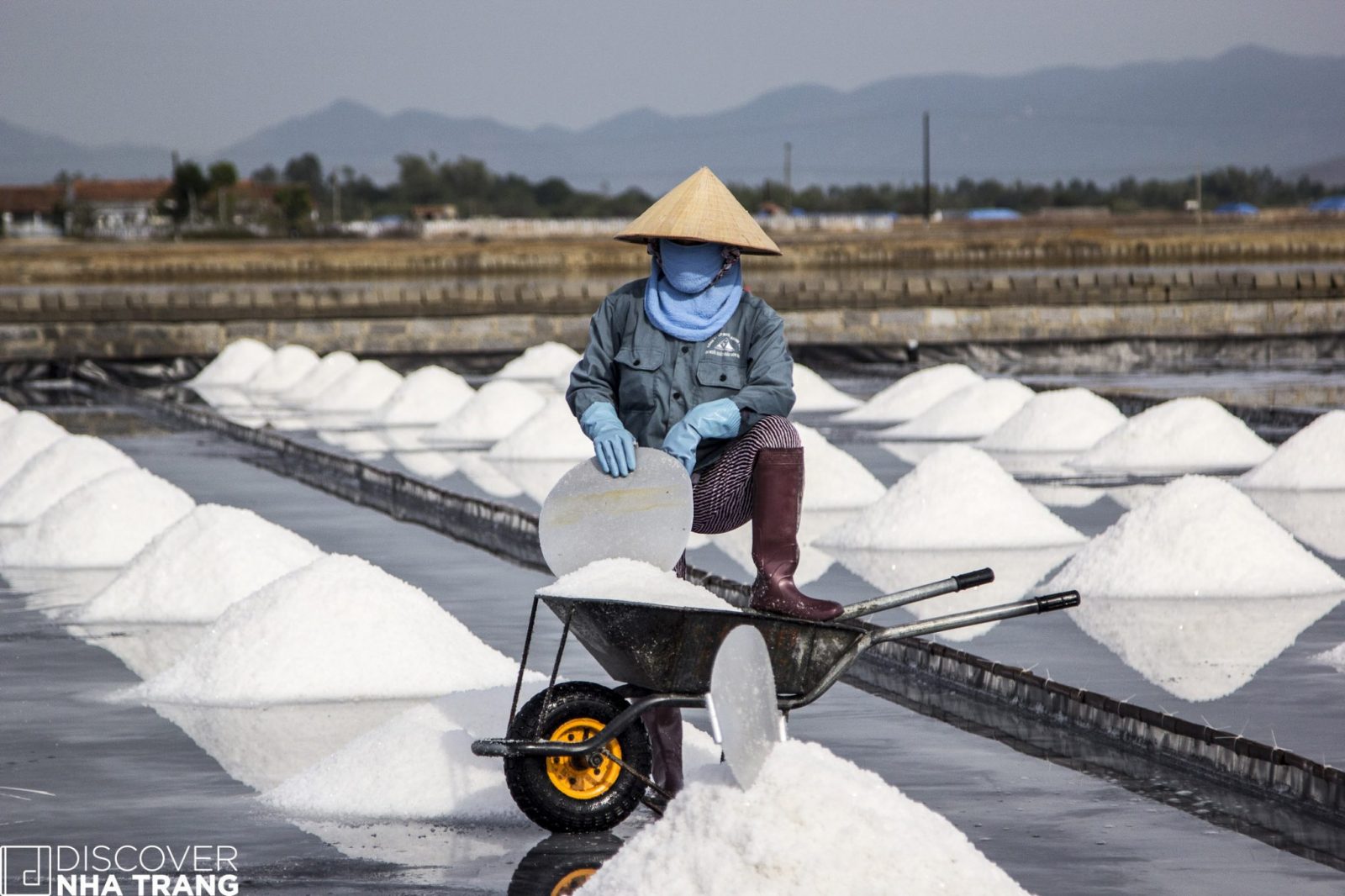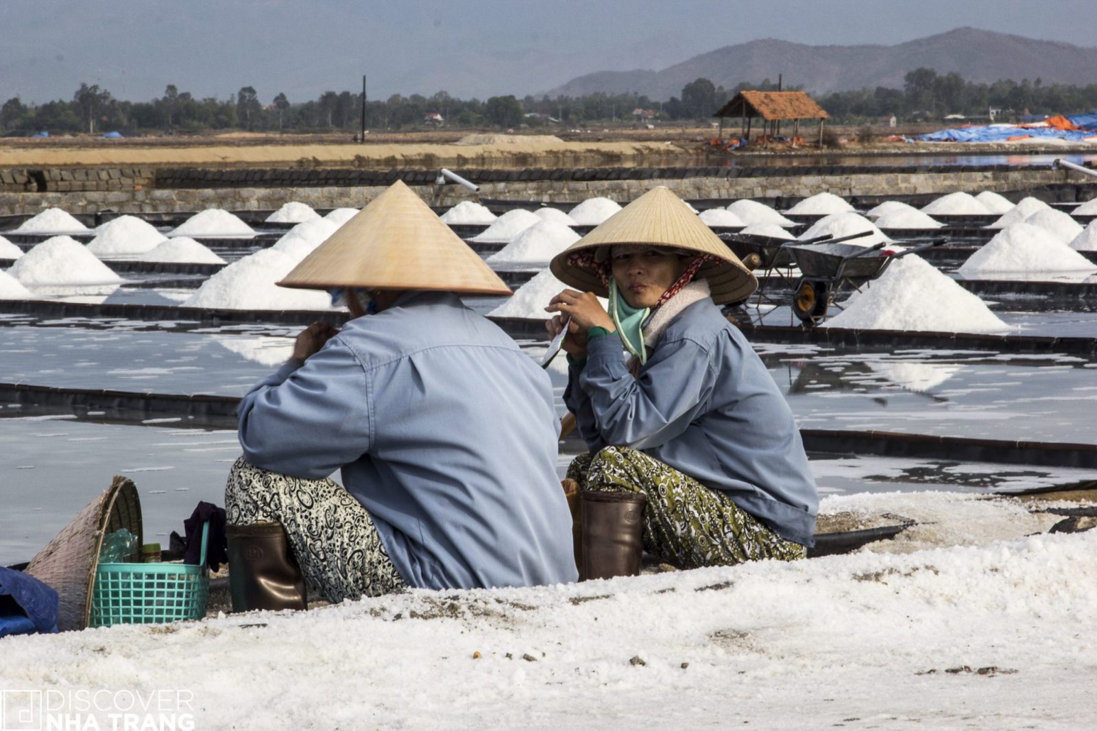 Sitting near a wheelbarrow for a short respite from the heat, Ms. My Lan – a very friendly lady, and lifelong inhabitant of the salt fields, happily shared her thoughts with the Discover Nha Trang Team, as she watched over her son at work across the field: “I have been here for twenty-five years, but my son only started with me two months ago. He could go to work for one of the big factories in town, but he told me that he loves the salt fields and wants to be a Salt Farmer like me and his dad – so here we are happily collecting the “gift of the sea” together.”