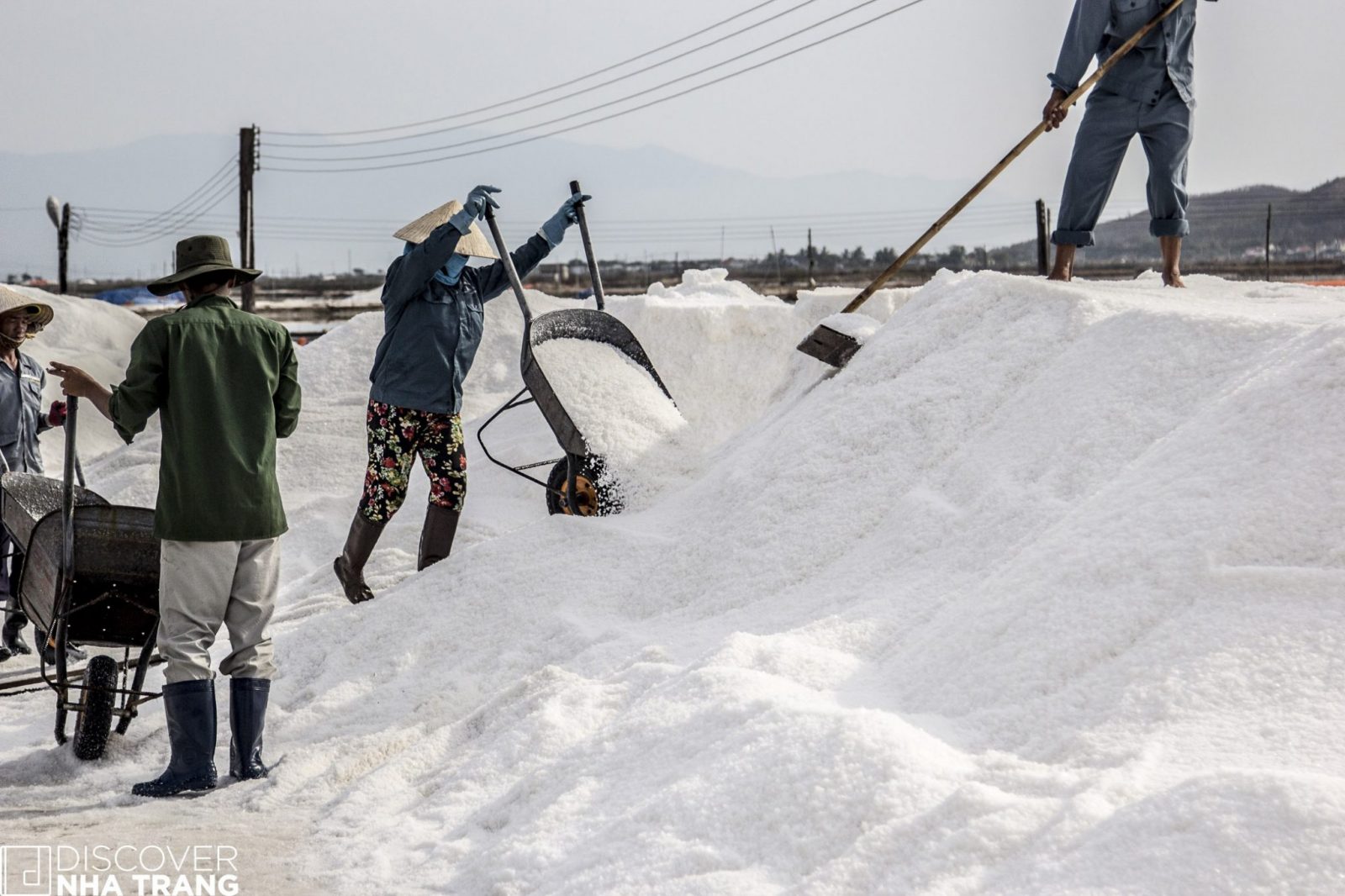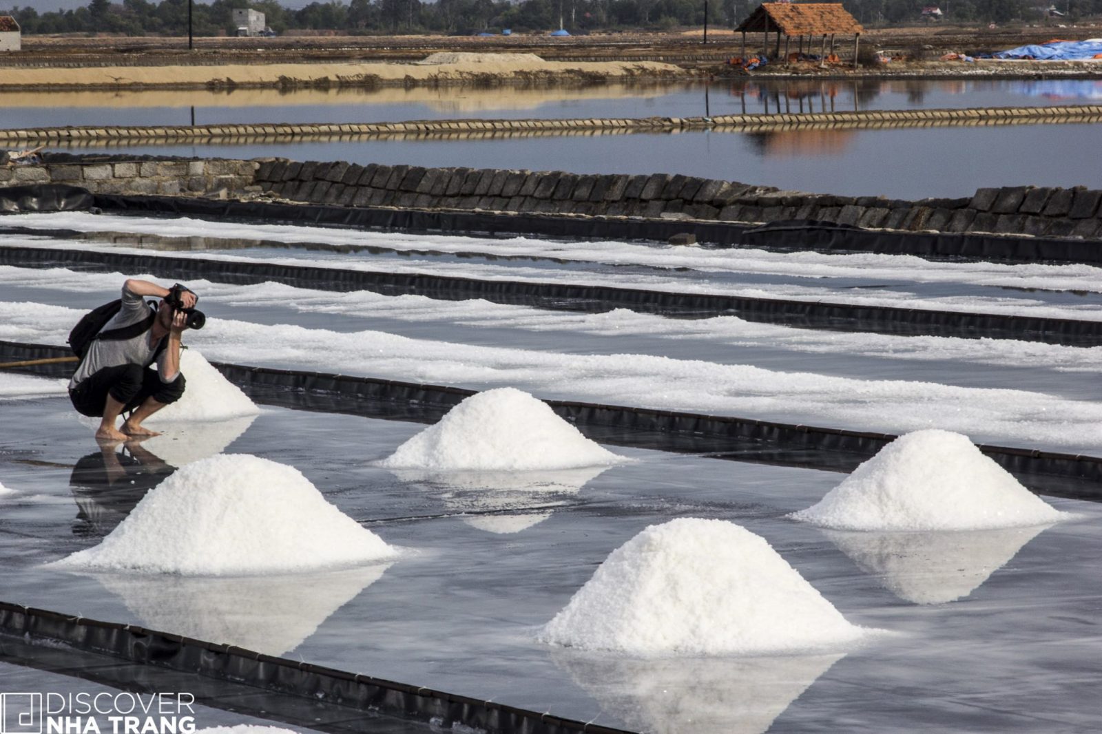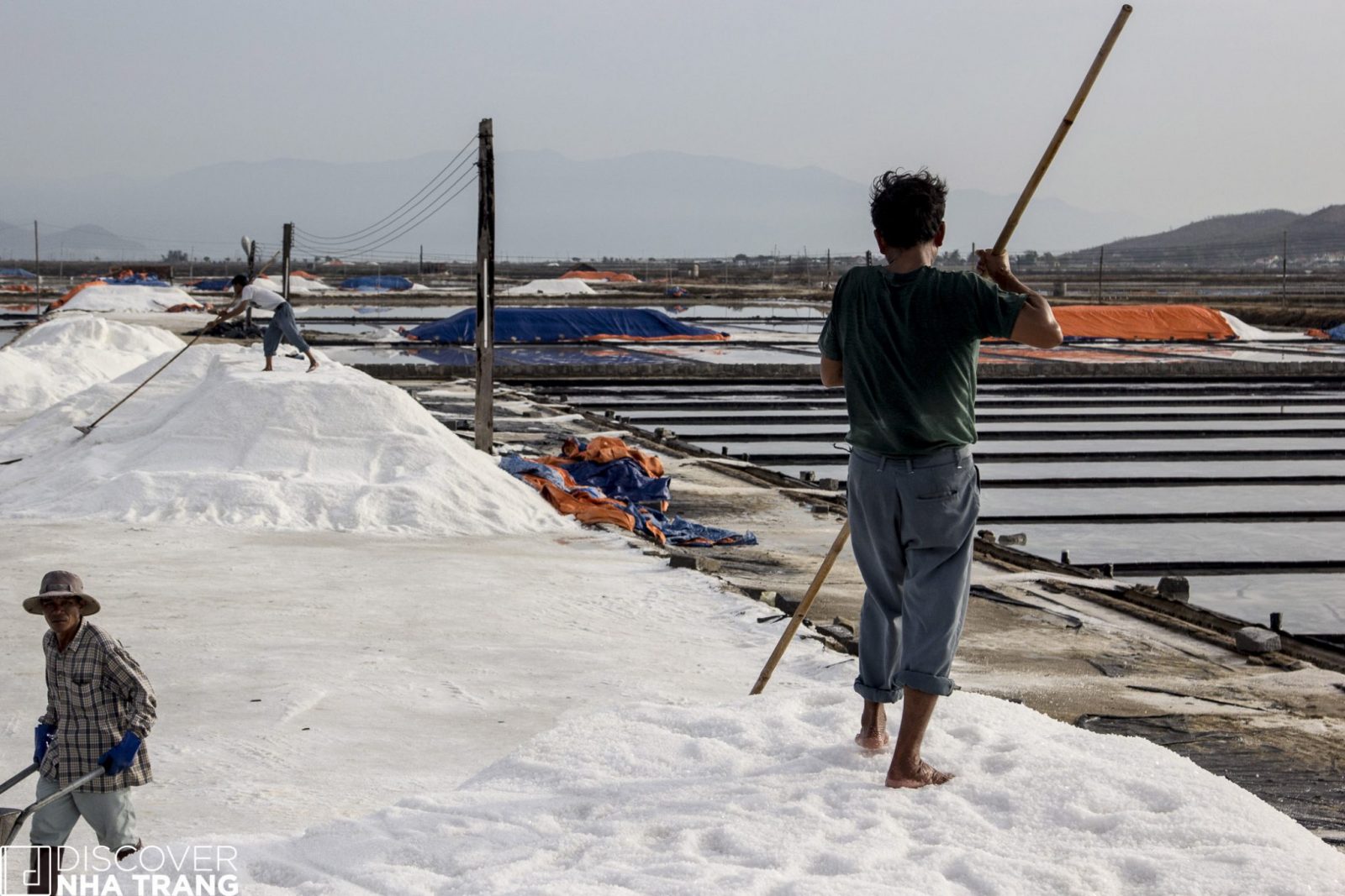 Sitting near a wheelbarrow for a short respite from the heat, Ms. My Lan – a very friendly lady, and lifelong inhabitant of the salt fields, happily shared her thoughts with the Discover Nha Trang Team, as she watched over her son at work across the field: “I have been here for twenty-five years, but my son only started with me two months ago. He could go to work for one of the big factories in town, but he told me that he loves the salt fields and wants to be a Salt Farmer like me and his dad – so here we are happily collecting the “gift of the sea” together.”